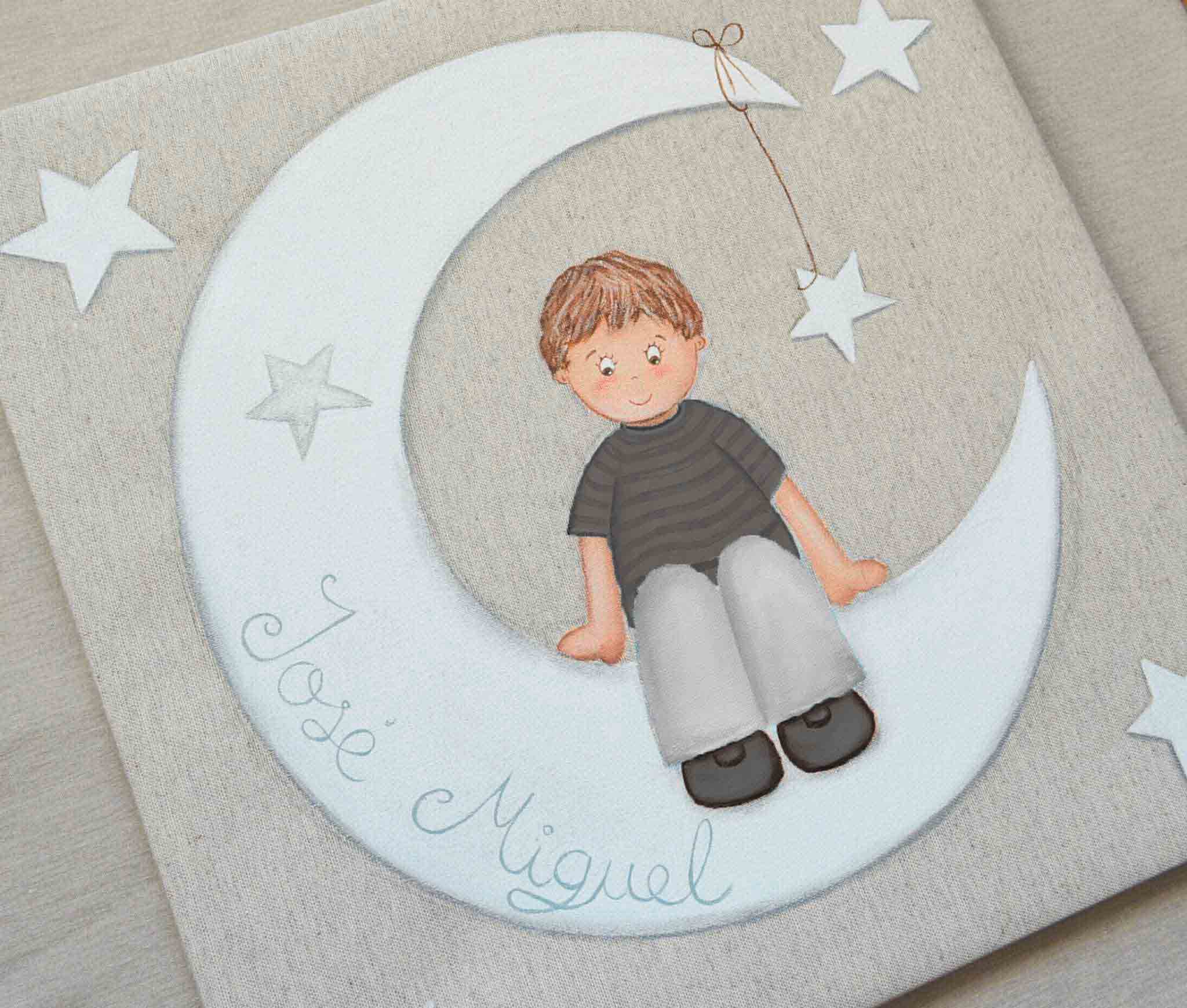 Llena de ternura la habitación de los peques con los cuadros infantiles NIÑO EN LA LUNA que forman parte del Universo «NIÑOS/AS» de AGuguGaga.