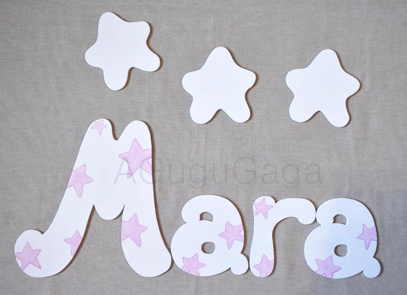 Se entregan con una cinta de doble cara de silicona. Se pegan fácilmente en paredes y superficies de madera como puertas y muebles. También quedan muy bonitas las iniciales del nombre en Mayúscula encima de una estantería. En este caso, las realizamos de grosor de 10cm.