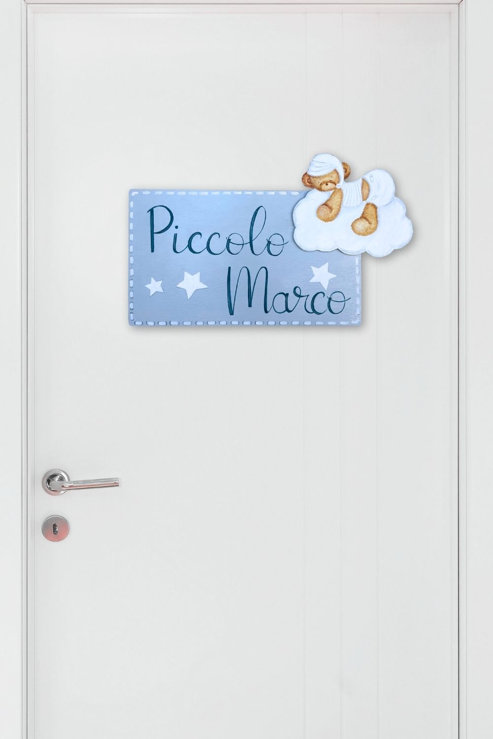 La PLACA INFANTIL PICCOLO BABY se compone de una placa rectangular y el osito en madera sobrepuesto con efecto relieve muy original.