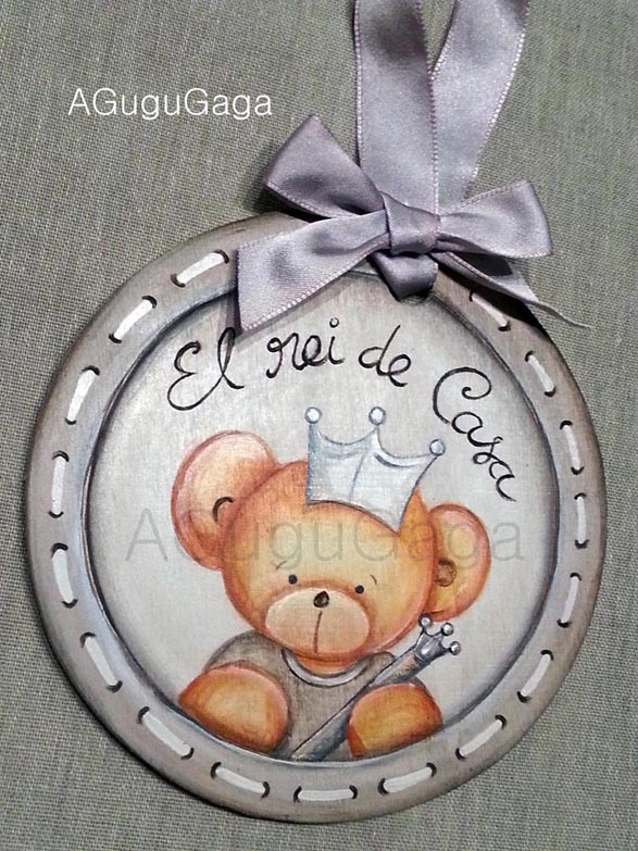 Preciosas placas colgantes para los pomos de puertas y muebles. Le dan un toque original a la habitación. Encargamos 4, conjuntamente con una silueta de madera con el osito durmiendo en la luna.
