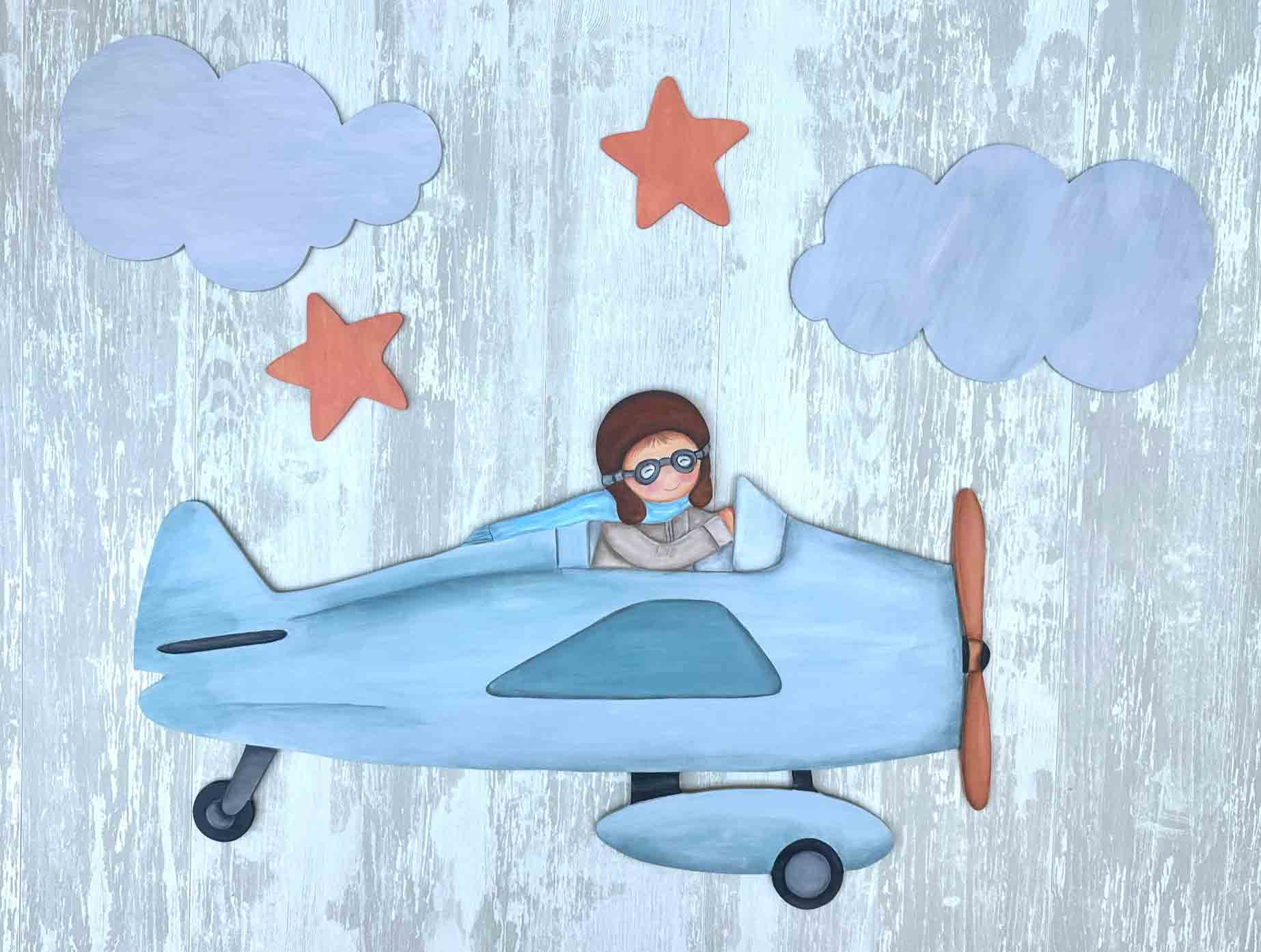 Esta Silueta de Madera NIÑO EN AVIONETA incluye la avioneta, 2 nubes y 2 estrellas. Pero si quieres decorar más espacio de pared, puedes añadir más complementos alrededor y conseguiremos una composición más grande. Cada complemento tiene un precio adicional que puedes consultar en el apartado -> COMPLEMENTOS.