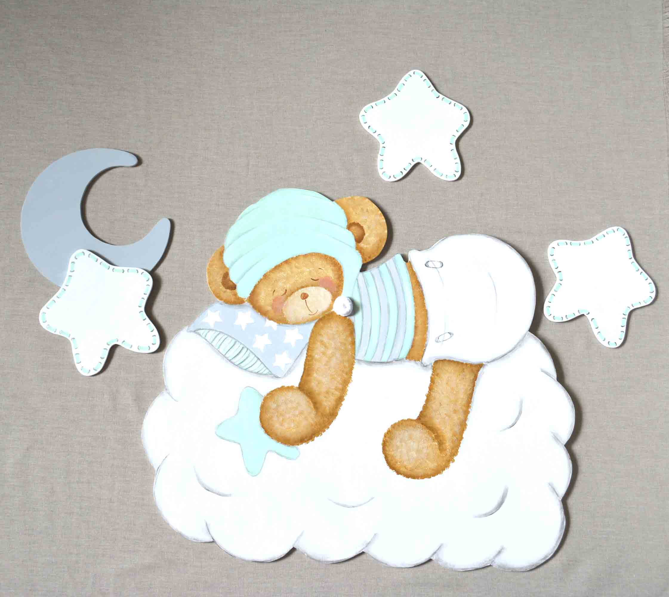 Producto artesanal dibujado y pintado a mano. Medidas: silueta osito en la nube 60x45cm, estrellas 17×17 cm, luna 30x30cm